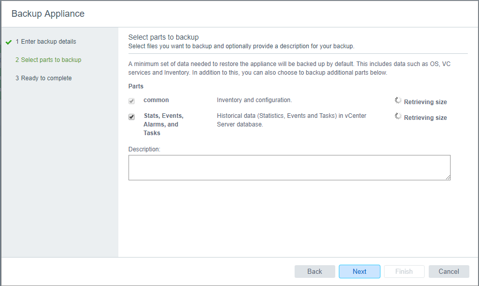 After we clickย Next, we shouldn’t see any errors if the FTPS connection is configured properly and we will see the process begin retrieving backup sizes for the various components.