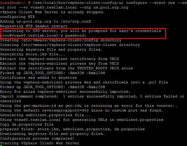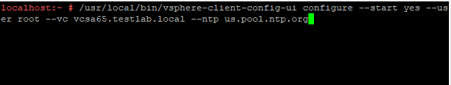 /usr/local/bin/vsphere-client-config-ui configure --start yes --user root --vc <your VCSA appliance FQDN or IP> --ntp <NTP server address>
