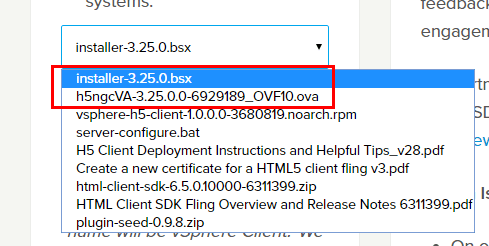 The appliance can be downloaded from the official HTML5 Web Client Fling page found here.ย A note here – the Fling download link will be for the update package first.ย You will need to pull down the dropdown box to display the OVA appliance to download if you are deploying a new installation.ย Below, highlighted are theย bsx update file and theย ova appliance file.ย The BSX again is for updates, and the OVA is for deploying a new appliance.