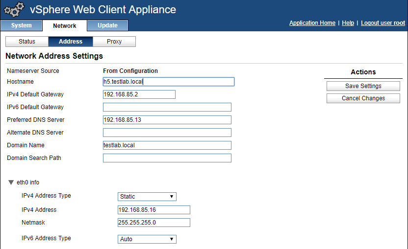 If we choose to use the HTML5 native web client, we can login tot he VAMI interface viaย port 5480 on the appliance and finish out customizing IP configuration there.ย The default credentials: