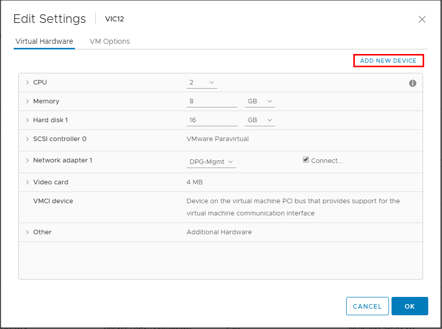 After moving the 2nd hard drive over, we edit the settings of our new VIC appliance and choose Add New Device.