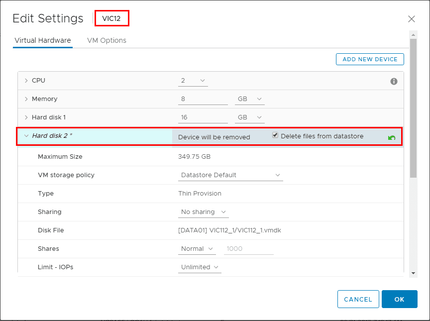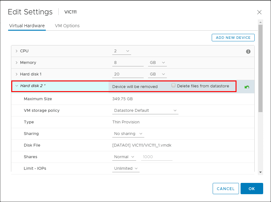 For our previous VIC appliance, we remove the 2nd hard drive.  Note We do not delete files from datastore.