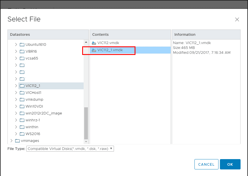 Next, we need to move the 2nd hard drive from the folder of the old VIC appliance on the datastore to the folder of the new VIC appliance on the datastore.