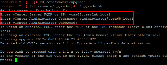 The upgrade script will ask a series of questions including the vCenter Server FQDN or IP, vCenter Administrator Username, vCenter Administrator Password, and will also ask whether or not you are running an external PSC.