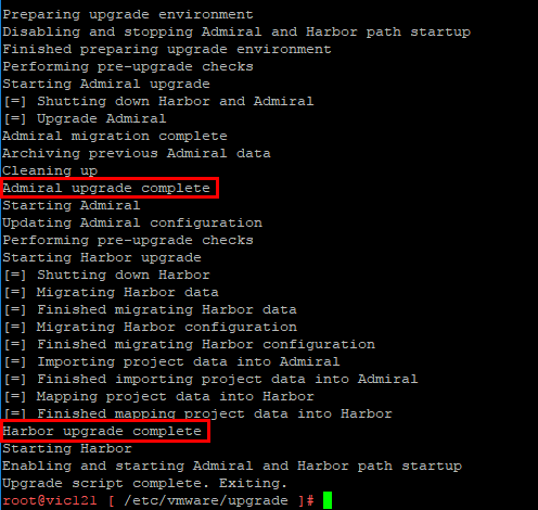 Now we let the script run and do the upgrading of both Admiral and Harbor. We should see both operations complete successfully.