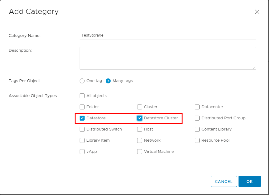 Here we need to define the tag category to include object typesย Datastore andย Datastore Cluster.