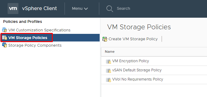 The process to create VMware virtual machine storage policies is fairly straightforward.ย In this walkthrough, I will be using the HTML5 web client to create the policy.ย The first thing we do is navigate toย Menu >> Policies and Profiles in the web client, or theย Home buttonย >>ย Polices and Profiles.