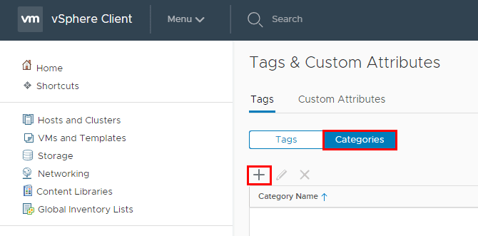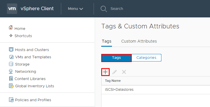 Our first step to using storage policies if we want to tag our datastores with custom metadata that we define is to create tag category and tags.ย First we select to create a newย tag category.ย Click the Categories button and the + sign.