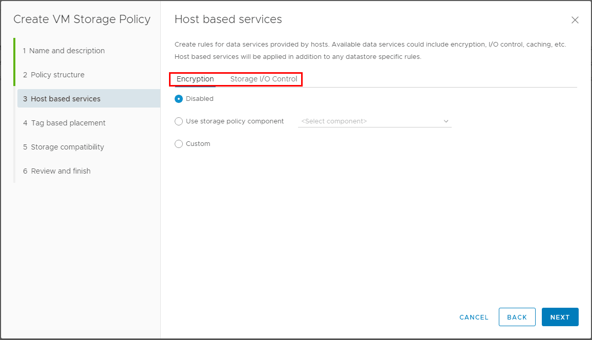 Under the Host based services, we can configure options for Encryption or Storage I/O control.