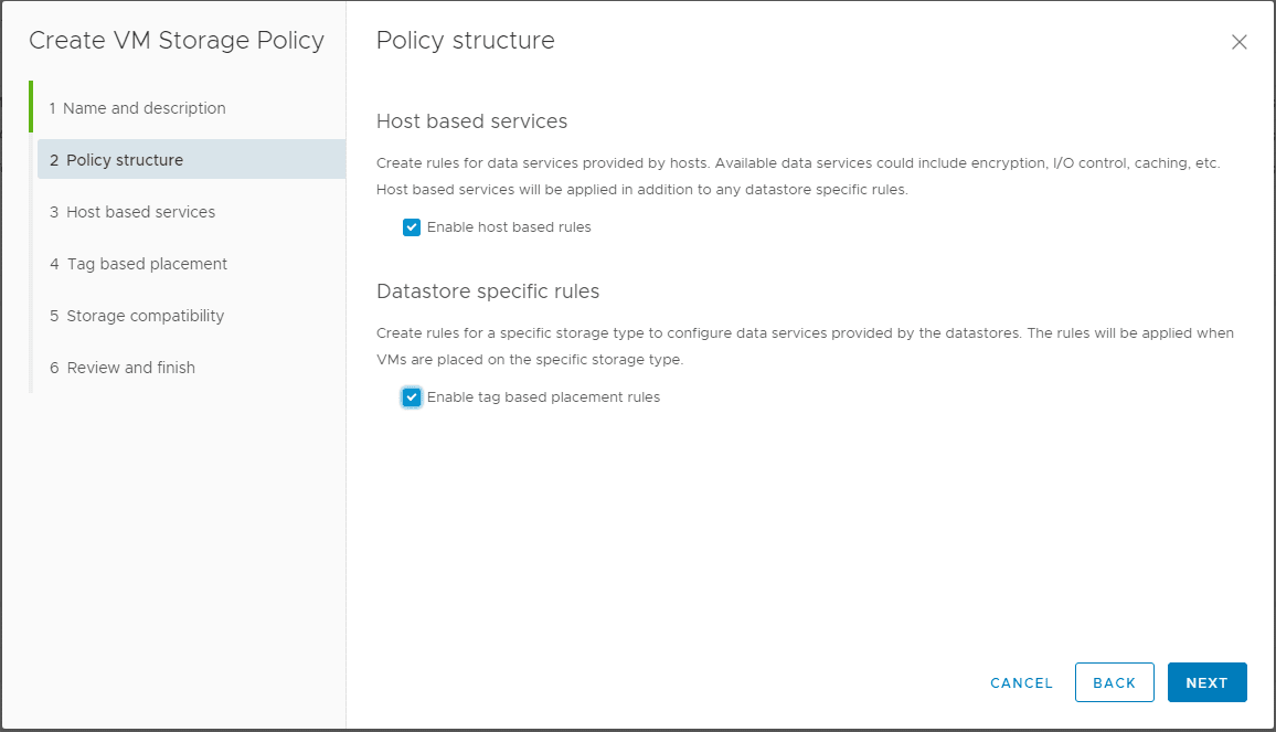 Noteย If you don’t have any storage related tag categories defined, you will see the error on theย Tag based placementย screen showingย No storage related tag categories available.
