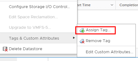 Now we will assign the new tag to the datastore of our choosing.ย Right click your datastore and select theย Assign Tag option from theย Tags & Custom Attributes menu option.