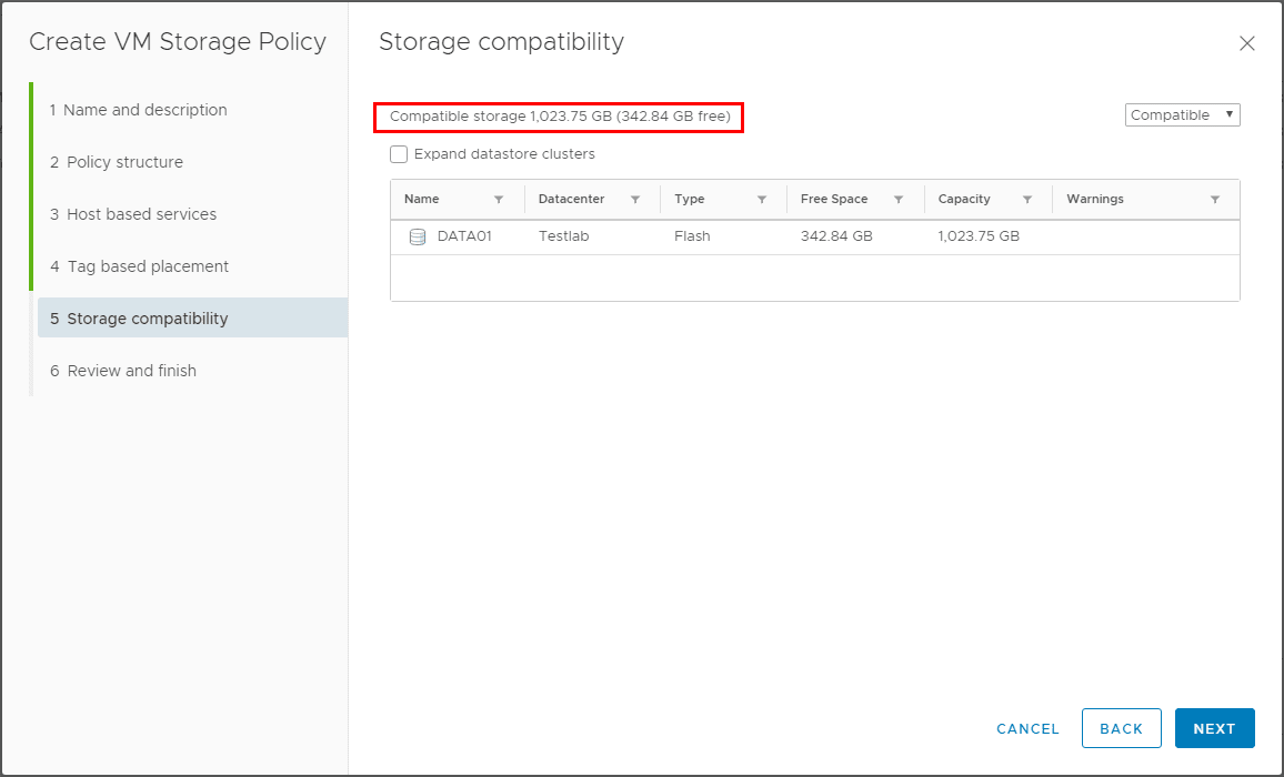 As we can see below, when we get to theย Select storage screen, we can select the custom VM Storage Policy which results in the compatible datastore.