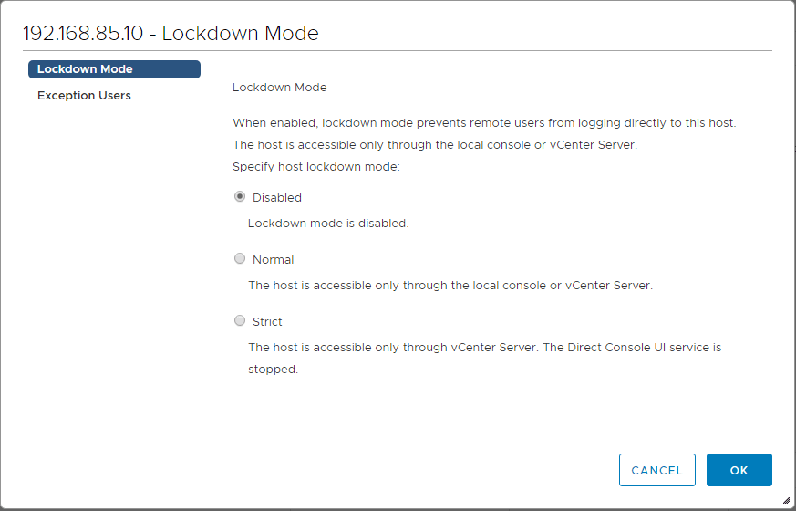 Lockdown mode is a great way to increase the security stance of a VMware ESXi server.ย Lockdown moe disables direct communication with an ESXi host and requires the host is managed by vCenter Server.ย This makes sure the roles and access controls that are implemented at the vCenter Server level are always enforced and someone would not be able to bypass this by simply logging in directly to the VMware ESXi server itself.ย This helps to minimize the risk of someone getting privileged access outside of permissions assigned at the vCenter level.ย This helps to centralize access and permissions through vCenter access only.