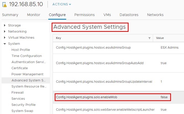 When we control access to hosts and in particular the DCUI, Shell, SSH, and MOB we can further restrict access and security harden our VMware ESXi hosts.ย We can disable the DCUI by stopping the service or by enabling Lockdown mode.ย ESXi shell is disabled by default so we want to make sure to keep it that way or tightly monitor to make sure it doesn’t get enalbed.ย SSH is a service that we often enable and disable, but again, making sure this is controlled via Host Profiles, etc, we can minimize that attack surface.ย Theย Managed Object Browser or MOBย can be helpful to explore in certain cases, however needs to be disabled for general purposes.ย Make sure this is disabled here by checking the following advanced configuration setting.ย If set toย false it is disabled.ย ย True is enabled.