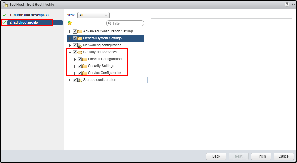 Host profiles are configuration management at the host level. They allow maintaining configuration consistency and correctness across the datacenter. Host Profiles eliminate having to configure everything by hand and are able to capture configuration including networking, storage, security and other settings. Having consistent configuration is very important as relates to security. However, another important benefit that host profiles bring to the mix is the ability to monitor for host configuration errors and deviations. Host profiles can monitor for host configuration changes and ensure the hosts are brought back into a state of compliancy. This is also key when thinking about security as changes to the host can be caught and remediated.ย Below, you can see the security configuration contained within the host profile.