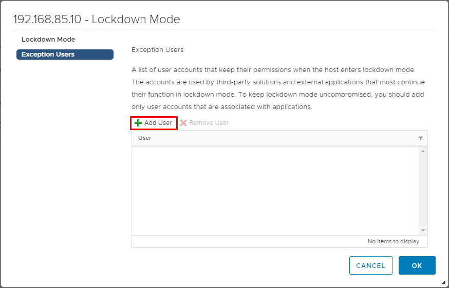 Noteย Users who are listed in theย DCUI.Access.listย are allowed to override lockdown mode and login to the DCUI.ย By defaultย the root account is the only account listed in this list.