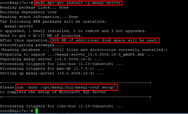 So, let’s kick off the installation yet again.ย I might add, the installation of SQL Server 2017 on Ubuntu was blazing fast!ย Must faster than installation on a Windows Server system.