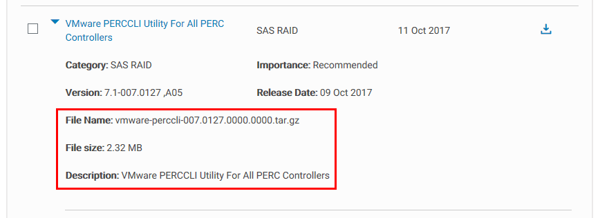 To obtain the PERCCLI utility, simply plug in your service tag on the Dell Support site, and select either VMware 6.0 or VMware 6.5 for the operating system.ย Note the format is aย tar.gz package.
