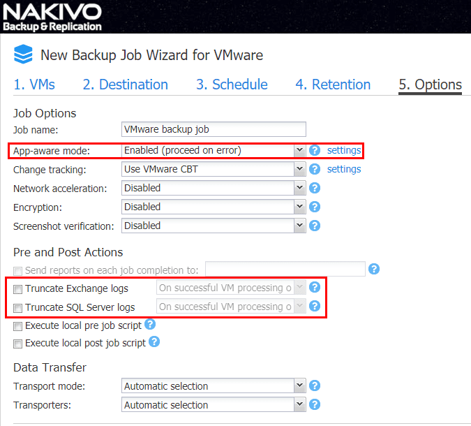 Most businesses run business critical applications on top of databases or other applications that require transactional consistency.ย Microsoft SQL Server and Microsoft Exchange Server are two examples of applications that require transactional consistency.ย VMware backups that utilize โapplication-awareโ backups interact with Microsoftโs VSS to flush all in memory or pending disk I/O operations to disk so that backups include all transactions within the backup run.ย Otherwise, the backup may be inconsistent when it comes to the application database and require further steps such as replaying logs to bring the database up to a consistent state.ย Nakivo Backup & Replication allows performing โapp-awareโ backups and replication to make sure applications are backed up in a consistent state.ย This also allows other beneficial operations such as log truncation to take place.