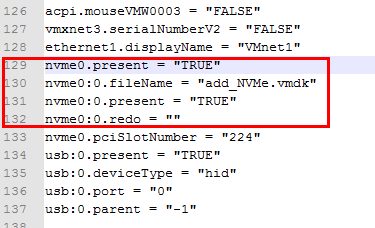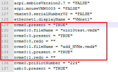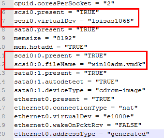 - Edit the VMX file to change references to the existing LSI SAS controller to NVMe