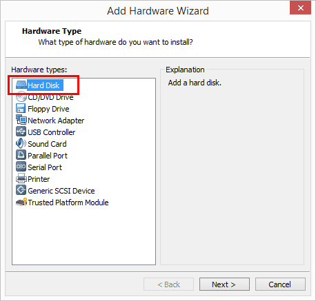 This begins the Add Hardware Wizard. We choose Hard Disk since we want to add a new NVMe hard disk.