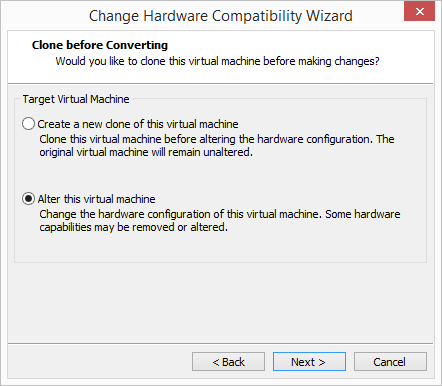 To be safe, you can choose to Create a new clone of this virtual machine to make sure you have an original copy of the virtual machine and its configuration before altering compatibility. However, I am simply choosing to Alter this virtual machine without creating a clone.