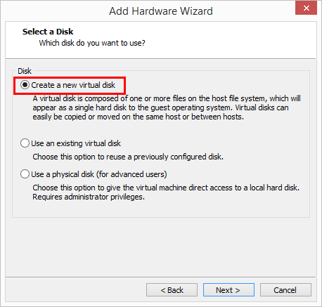 Here, choose to create a new virtual disk. Since in this case, we are trying to get our boot drive changed over to the NVMe hard disk, we need to get the driver installed. The quickest way to do that is to create a tiny new NVMe hard disk and allow the driver to install. Then, we will change our boot drive over to the new NVMe controller.