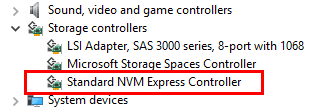 Note in Windows device manager, you should see the new Standard NVM Express Controller appear.