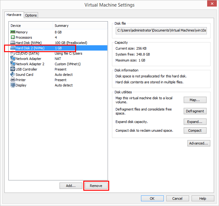 Now, add the virtual machine back to your VMware Workstation 14 inventory and we can remove the secondary hard disk that we added to install the NVMe driver.