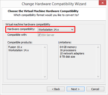 - Change Hardware compatibility to VMware Workstation 14.x