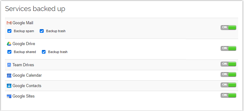 - Cloud to Cloud backups – Powerful automated backups of the G Suite environment copied to AWS storage providing a solution that doesn’t rely on Google infrastructure and safely backs up G Suite data encrypted in-flight and at-rest. Backups include Gmail, Drive (including Team Drives), Contacts, Sites, and Calendar.