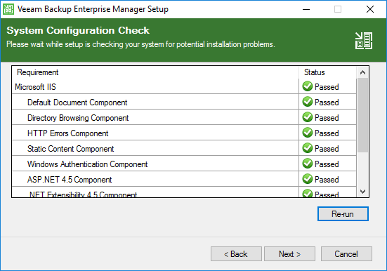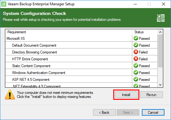 On the System configuration check, it will scan the system for missing components. Simply click the Install button to install the missing components. I really wish other vendors would take a note from Veeam here as they automatically install the missing components instead of make you go out and fetch them yourself.