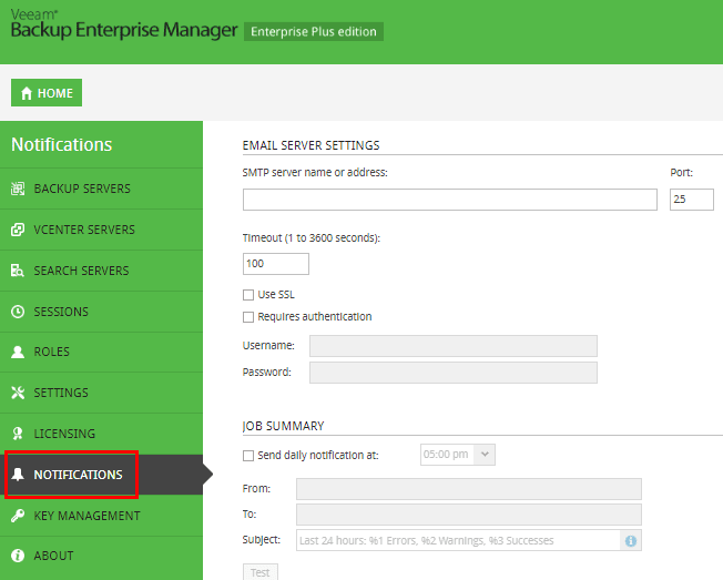 Under the Notifications tab, you can setup your SMTP server and configure various notifications.