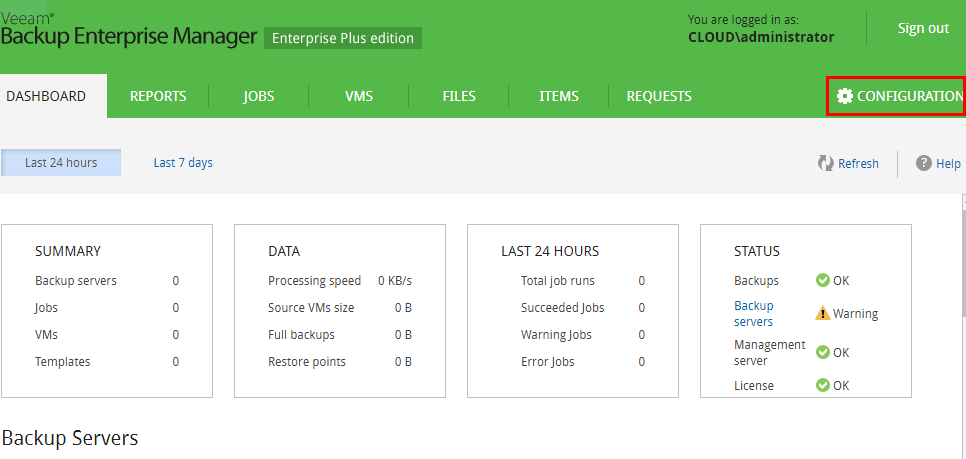 Configuring Veeam Backup Enterprise Manager is fairly straightforward and involves adding in the Veeam Backup servers in the environment. Additonally, we configure notifications and other normal configuration to receive emails of events configured. Let’s look at a few of the configuration changes we want to make after getting Veeam Backup Enterprise Manager installed. Click the Configuration button in the upper right.