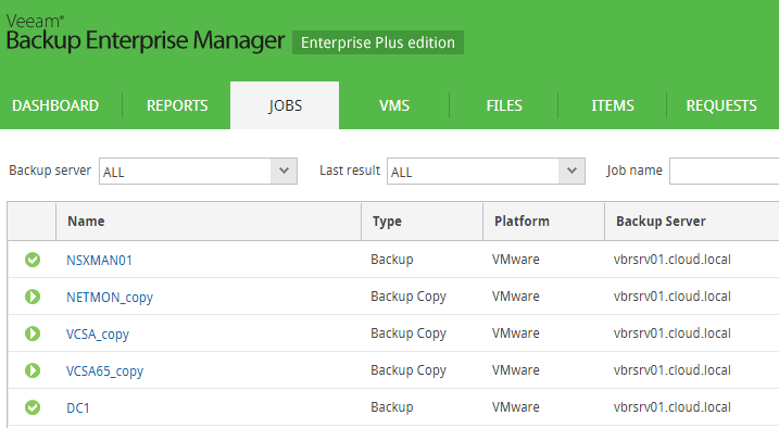 Looking at the Jobs tab will show you all jobs across all Veeam Backup & Replication servers. Pretty nice!