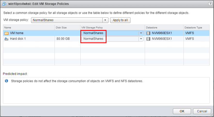 Now we select the new VM storage policy we defined from the dropdown menu. Click the Apply to all to apply the policy to all the VM files and click OK.
