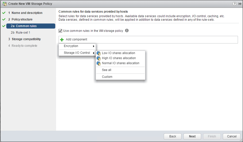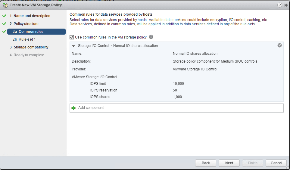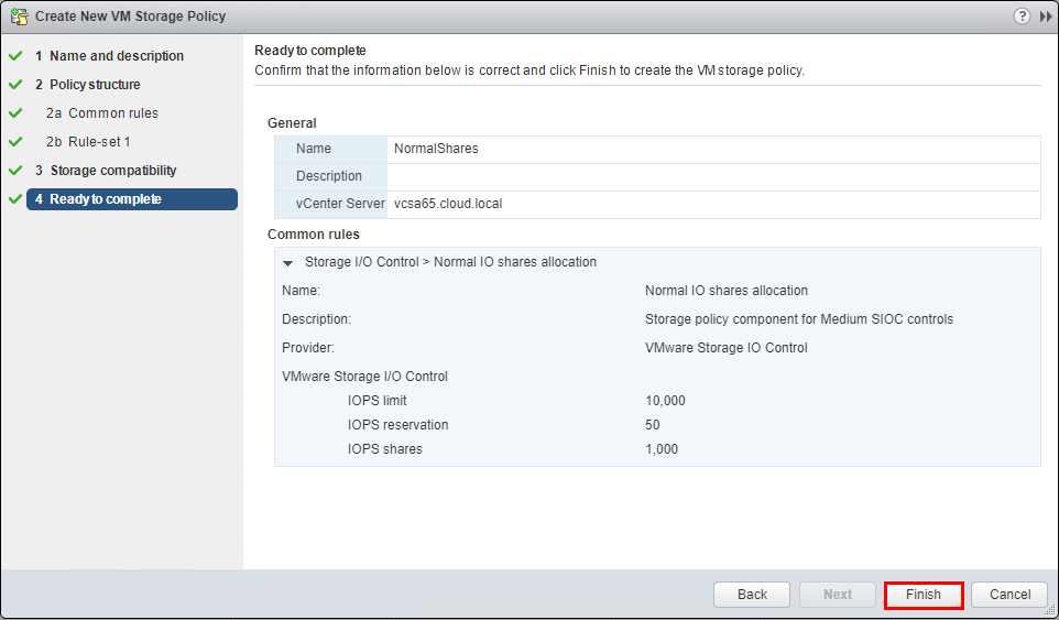 Click Finish to finalize the new Storage I/O Control VM Storage Policy.