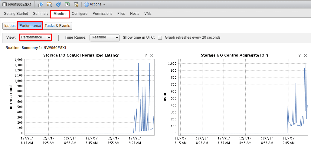 Monitoring VMware Storage I/O Control can be done from the Storage >> <Datastore > >> Monitor >> Performance, Performance View dropdown. You will see the following windows measuring Storage I/O Control: