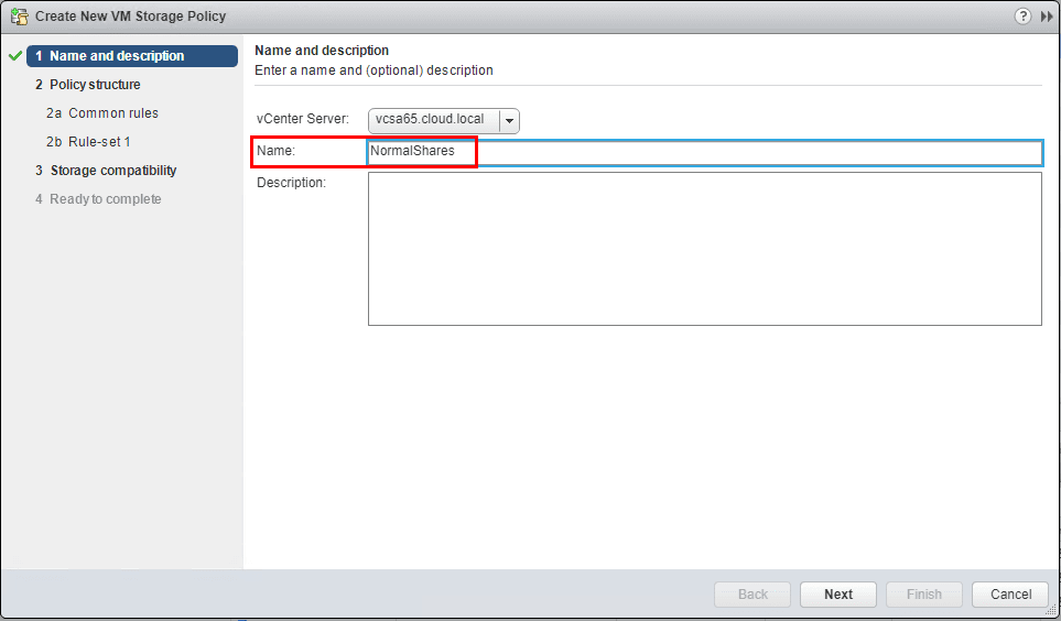 This launches the Create New VM Storage Policy wizard. We begin by naming the policy.