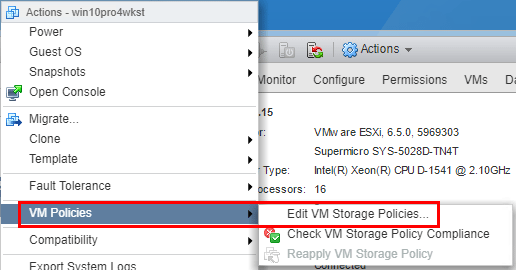 Now that we have our new Storage I/O Control VM Storage Policy defined, we can apply it to a virtual machine. Right-click the virtual machine and select the Edit VM Storage Policies.