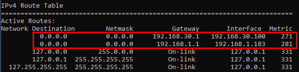 In the Windows world, you can have multiple gateways defined, albeit with a warning from Windows itself. The problem with multiple gateways in Windows is that you aren’t really able to utilize these as you would think. Windows assigns metrics to both gateways and the lower metric is always used. If a failure in that gateway is detected, the other gateway is used, most likely resulting in routing issues nonetheless. The problem comes down to the fact that Windows can only have one routing table defined. Even if you have multiple connections and gateways, each connection will reference the same routing table with only a primary gateway. So. despite having two network cards potentially connected to two different ISPs, only one will be used.