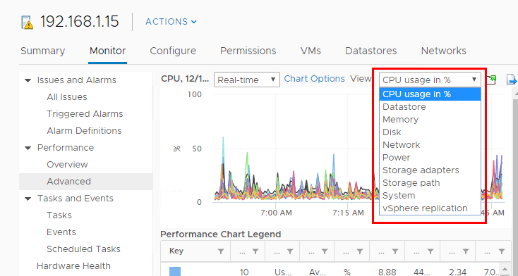 In vCenter Server itself, there are some great performance monitoring tools that provide basic views of your environment and potential performance problems. They are fairly basic tools, however, to get a great overview of performance in a vSphere environment using the builtin tools, they are a good place to start. Notice in the combo box, you can select any of the primary performance areas of concern to get a graphical view of load, performance metrics, etc. Also, to the left, you can select from historical views aside from the Real-time view.