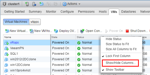Perhaps the easiest and most intuitive way to upgrade the VMware Tools version is simply using the GUI.ย For the most part here, I will be showing the Flash client instead of HTML5.ย The functionality is there with HTML5 however, there are still a few views that don’t appear with HTML5.ย The first helpful bit with the web client is to show theย “VMware Tools Version Status” column.ย To do this, right click in the default columns area, and you should see theย Show/Hide Columns option.