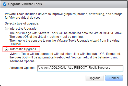 - Automatic Upgrade – The automatic upgrade process is preferable since you can run the upgrade without logging into each virtual machine.ย Additionally, by using theย Advanced Options switches, you can specify no reboot options such as the string below: