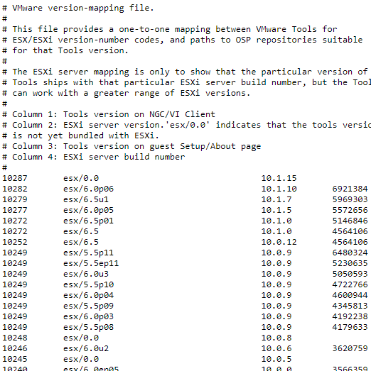 As shown above, we can see the Tools version as well as theย build version.ย VMware has a very helpful VMware Tools Version Mapping file link that is publicly available to check VMware Tools version.ย Interestingly, you can see at the top theย esx/0.0 listing next to the currentย 10.1.15 VMware Tools version showing the departure from the most current and a specific ESXi version.