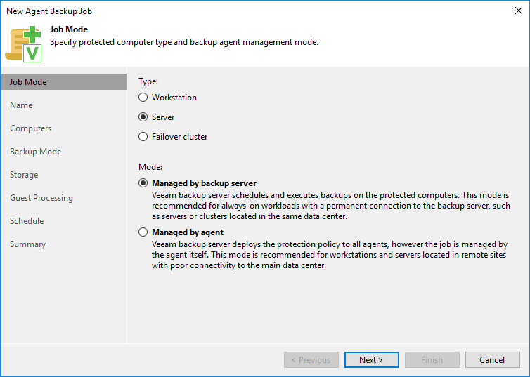 - Ability to protect Microsoft windows Server Failover Clusters with new agent-based failover cluster backup jobs. Additionally, you have the ability to restore guest files and application items from the new cluster backups