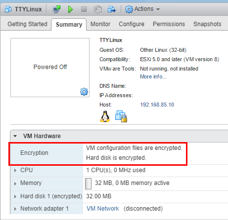 After powering off, and applying the VM encryption policy, the VM is sucessfully encrypted.