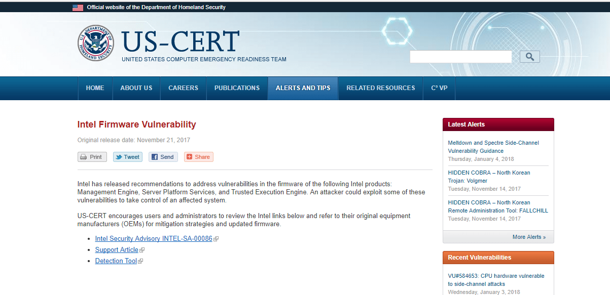 Source: https://www.us-cert.gov/ncas/current-activity/2017/11/21/Intel-Firmware-Vulnerability