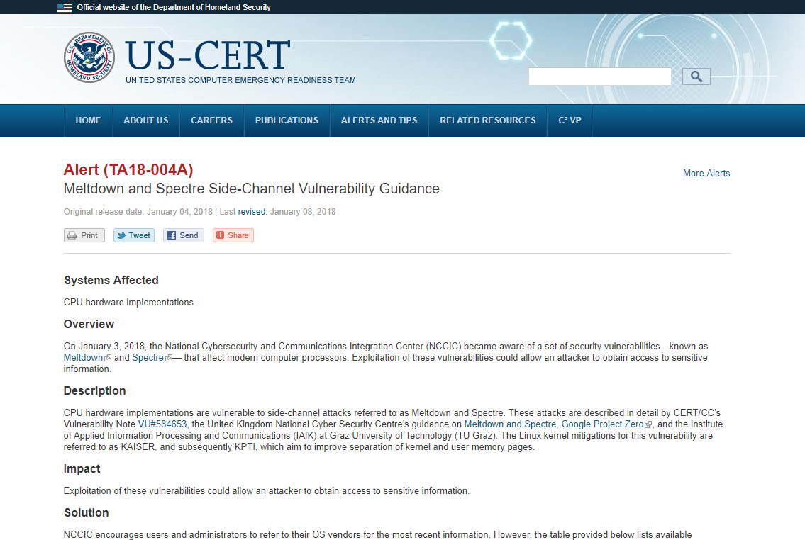 US-CERT, already mentioned above, showed its commitment to global data security by promptly publishing its Meltdown and Spectre Side-Channel Vulnerability Guidance. The Alert includes links to vendor information, advisories, and patches published in response to security flaws in processors.