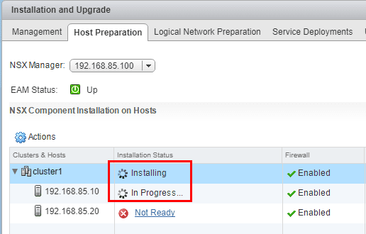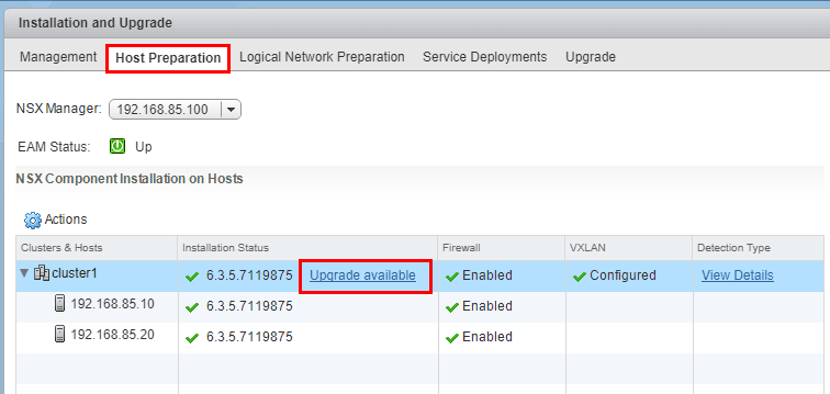 Next, if we navigate over to Host Preparation, we will see the Upgrade available link for upgrading the host VIBs.